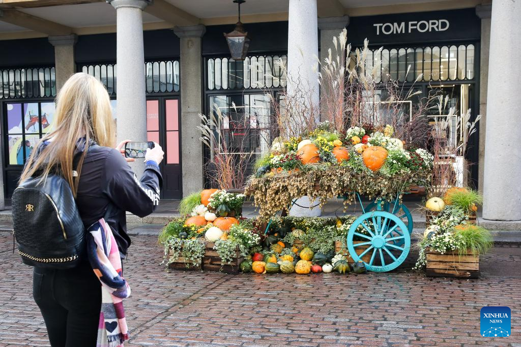 A woman takes photos of Halloween display in Covent Garden in London, Britain, Oct. 30, 2023. (Xinhua)