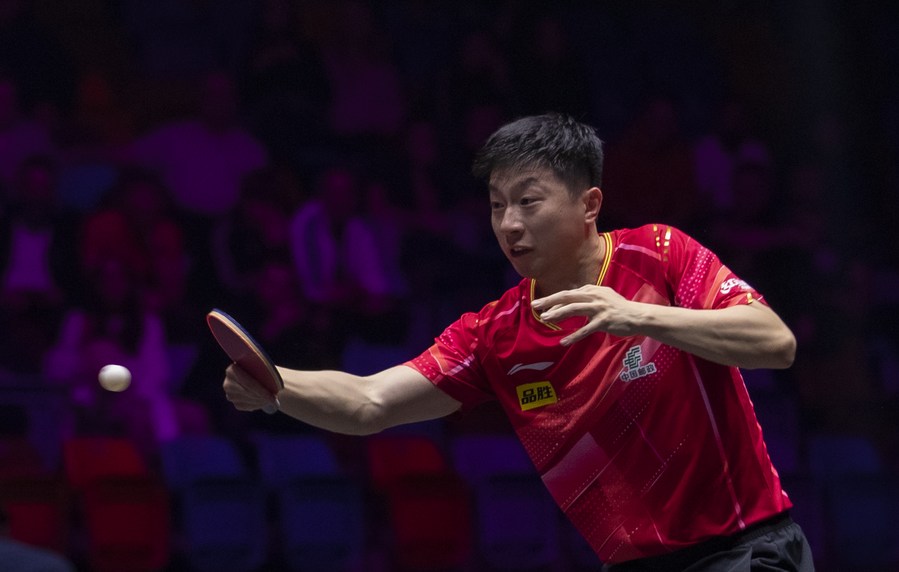 Chinese player Ma Long in action during the match against Chuang Chih-Yuan from Chinese Taipei at the 2023 WTT Champions Frankfurt on Oct. 31, 2023. (Xinhua/Zhang Fan)