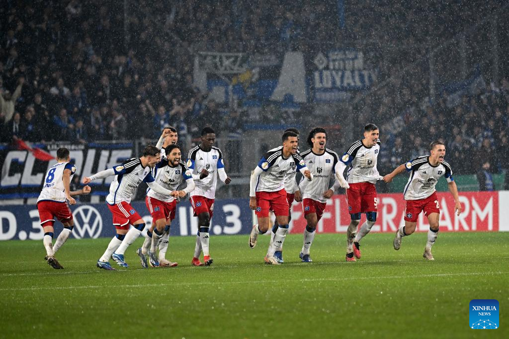 Players of Hamburger SV celebrate after winning the German Cup football 2nd round match between Arminia Bielefeld and Hamburger SV in Bielefeld, Germany, Oct. 31, 2023. (Photo by Ulrich Hufnagel/Xinhua)