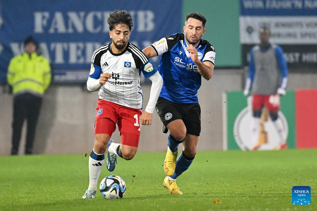 Can Hayri Ozkan (L) of Arminia Bielefeld vies with Ransford-Yeboah Koenigsdoerffer of Hamburger SV during the German Cup football 2nd round match between Arminia Bielefeld and Hamburger SV in Bielefeld, Germany, Oct. 31, 2023. (Photo by Ulrich Hufnagel/Xinhua)