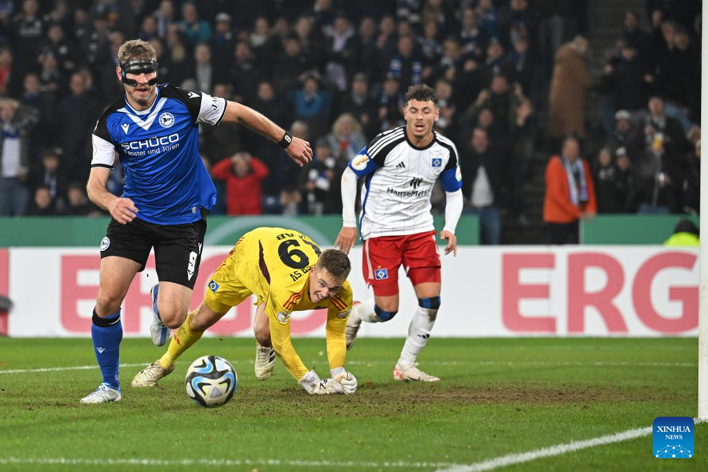 Matheo Raab (C), goalkeeper of Hamburger SV, challenges Fabian Klos (L) of Arminia Bielefeld during the German Cup football 2nd round match between Arminia Bielefeld and Hamburger SV in Bielefeld, Germany, Oct. 31, 2023. (Photo by Ulrich Hufnagel/Xinhua)