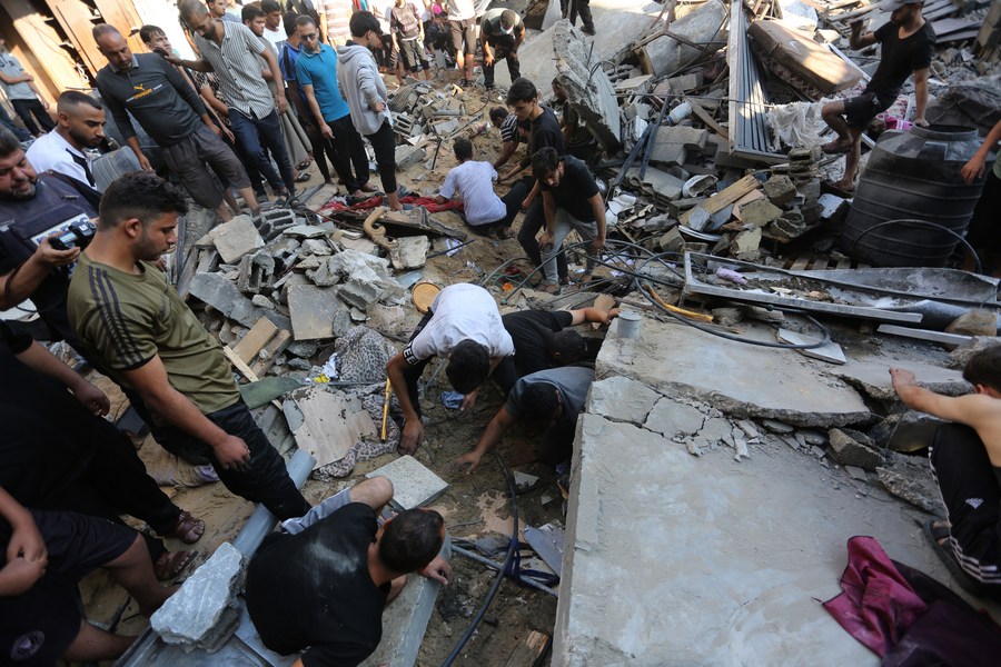 People search for survivors among the rubble of buildings destroyed in Israeli airstrikes in the southern Gaza Strip city of Rafah, on Oct. 31, 2023. (Photo by Khaled Omar/Xinhua)