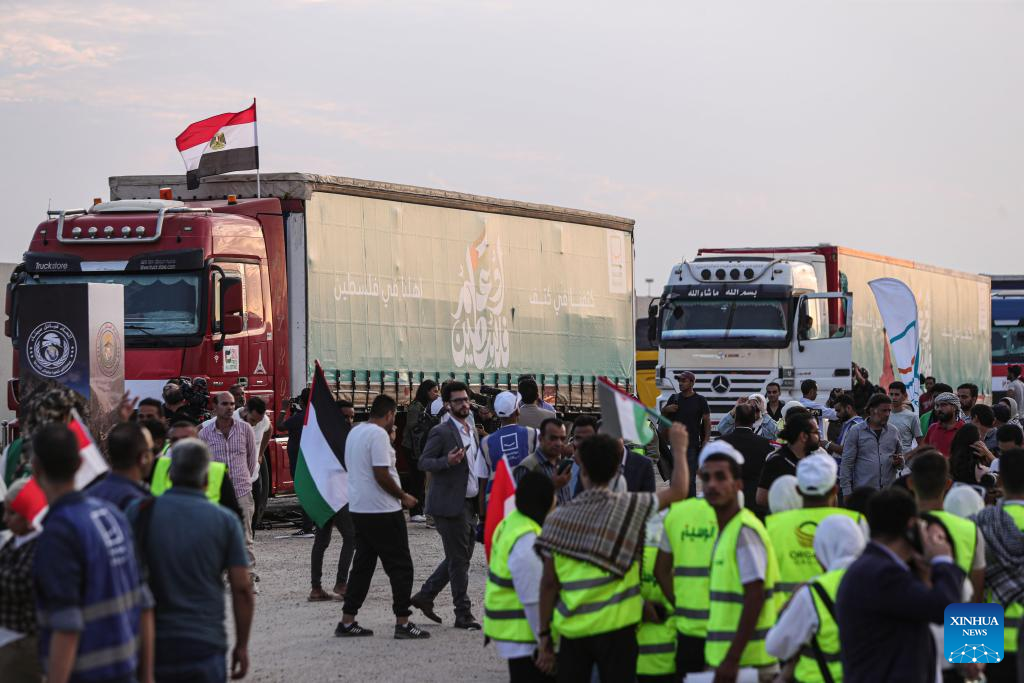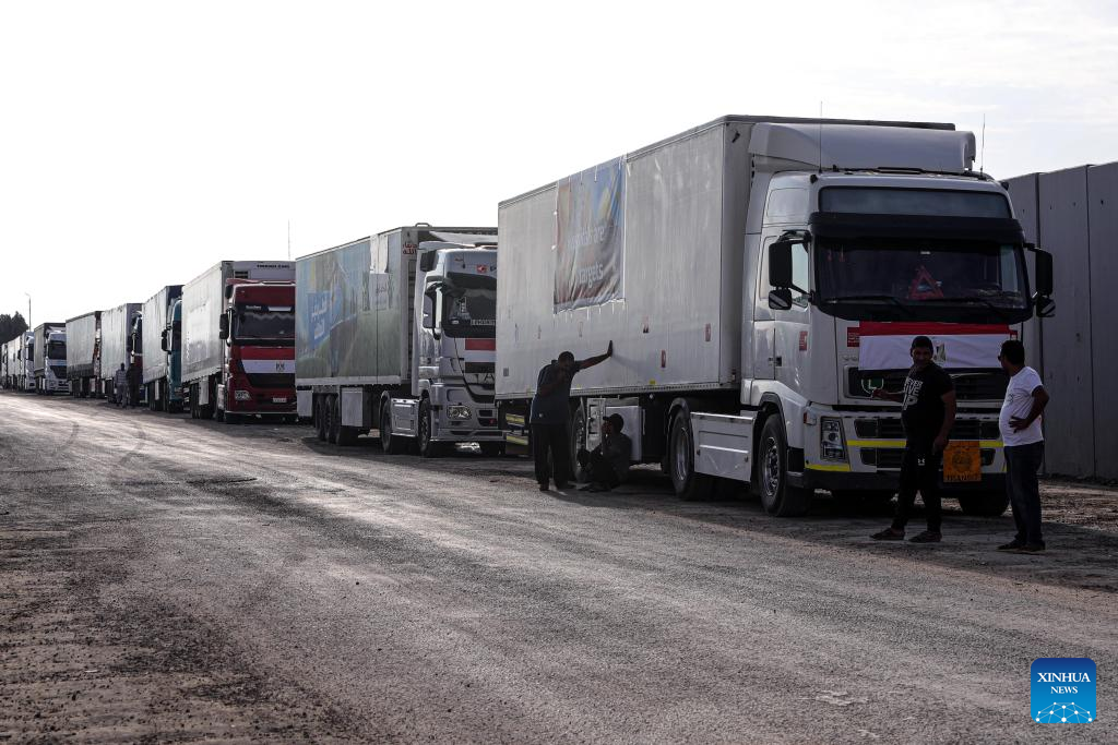 RAFAH, Egypt, Oct. 31 (Xinhua) -- Hundreds of trucks carrying relief aid have waited for days at the Egyptian side of the Rafah crossing to enter the war-torn Gaza Strip, home to 2.3 million Palestinians who have been deprived of fuel, food, water and medical supplies for nearly three weeks under Israeli blockades.