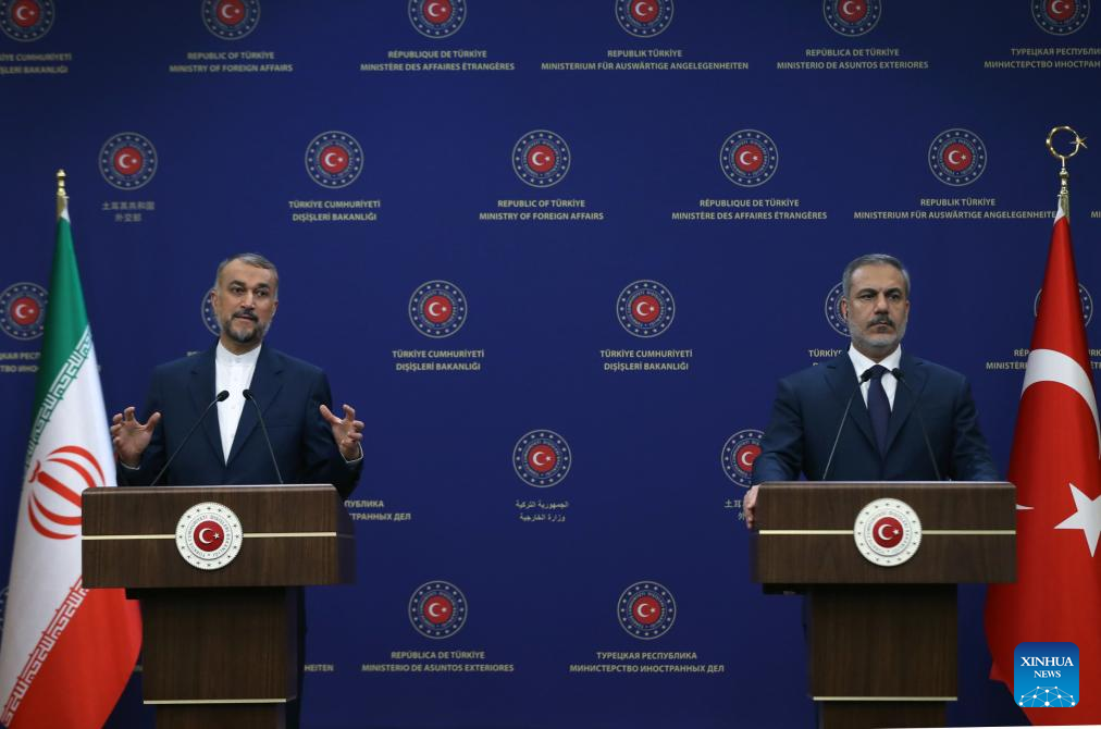 Iranian Foreign Minister Hossein Amir-Abdollahian (L) and Turkish Foreign Minister Hakan Fidan hold a joint press conference after their meeting in Ankara, Türkiye on Nov. 1, 2023. (Mustafa Kaya/Handout via Xinhua)