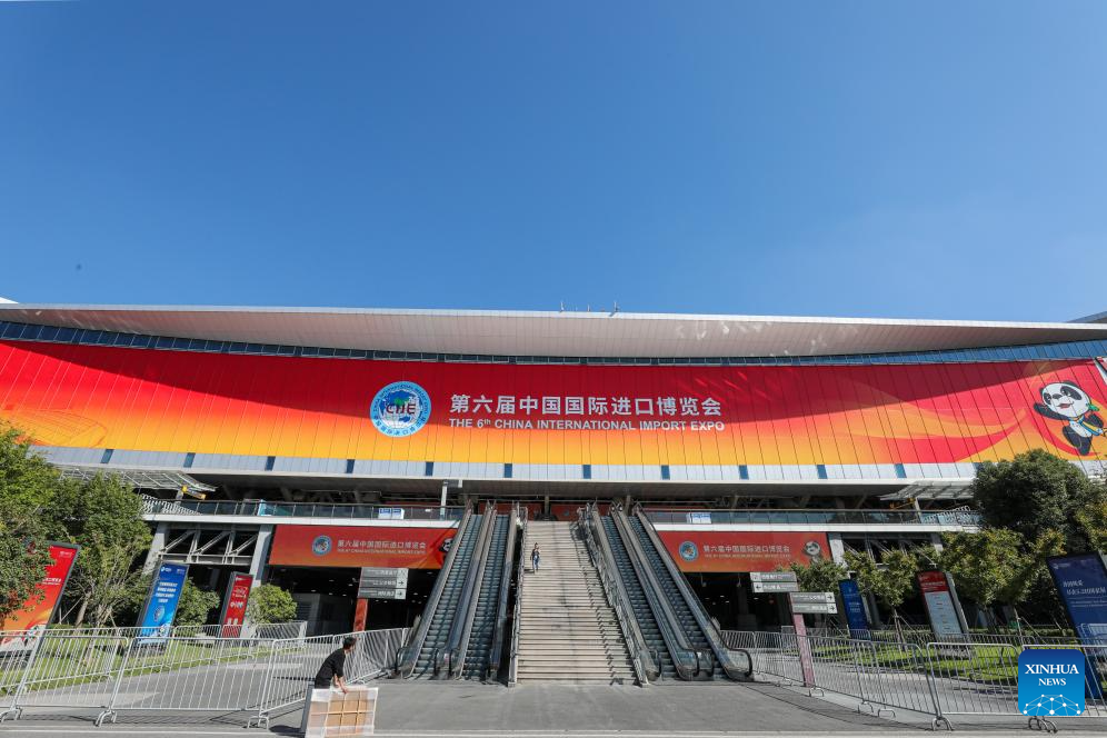 This photo taken on Nov. 2, 2023 shows the exterior view of the National Exhibition and Convention Center (Shanghai), the venue for the upcoming sixth China International Import Expo (CIIE), in Shanghai, east China. The sixth CIIE is scheduled to take place in Shanghai from Nov. 5 to 10. The preparation work at the National Exhibition and Convention Center (Shanghai) has entered the final stage. (Xinhua/Xin Mengchen)