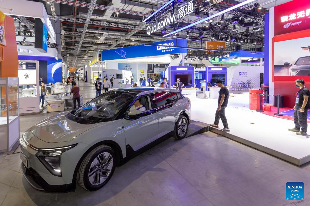 A smart electric vehicle, loaded with chips from Qualcomm, drives into the booth for the upcoming sixth China International Import Expo (CIIE), in Shanghai, east China, Nov. 2, 2023. The sixth CIIE is scheduled to take place in Shanghai from Nov. 5 to 10. The preparation work at the National Exhibition and Convention Center (Shanghai) has entered the final stage. (Xinhua/Wang Xiang)