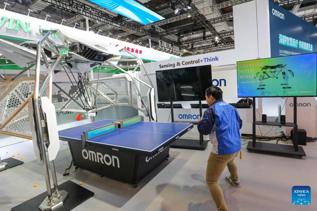 A staff member tests a coach robot for table tennis at the booth of Omron, arranged for the upcoming sixth China International Import Expo (CIIE), in Shanghai, east China, Nov. 2, 2023. The sixth CIIE is scheduled to take place in Shanghai from Nov. 5 to 10. The preparation work at the National Exhibition and Convention Center (Shanghai) has entered the final stage. (Xinhua/Xin Mengchen)