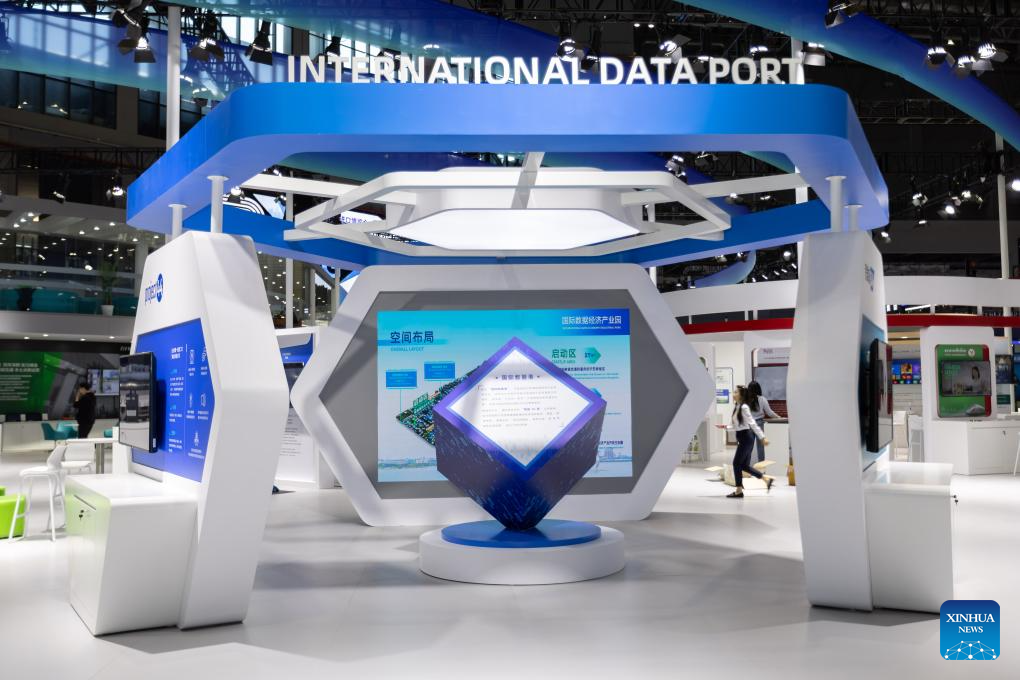 This photo taken on Nov. 2, 2023 shows the booth of International Data Economy Industrial Park, arranged for the upcoming sixth China International Import Expo (CIIE), in Shanghai, east China. The sixth CIIE is scheduled to take place in Shanghai from Nov. 5 to 10. The preparation work at the National Exhibition and Convention Center (Shanghai) has entered the final stage. (Xinhua/Wang Xiang)
