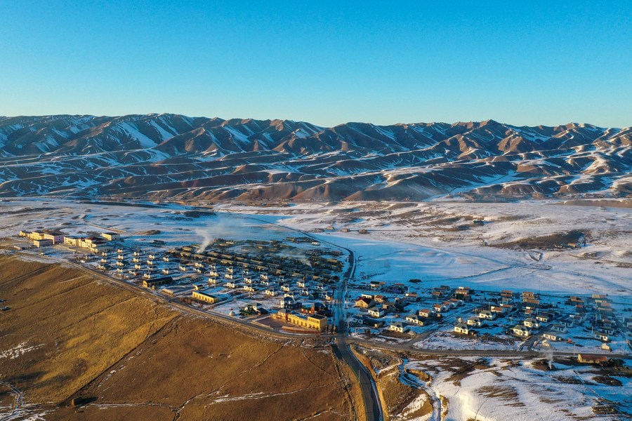 Aerial photo taken on Jan. 27, 2022 shows the view of a village in Karadala Township of Tekes County, northwest China's Xinjiang Uygur Autonomous Region. (Xinhua/Ding Lei)