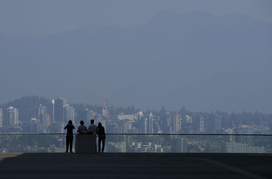 People gather at the waterfront in haze in downtown Vancouver, British Columbia, Canada, Aug. 26, 2023. (Photo by Liang Sen/Xinhua)