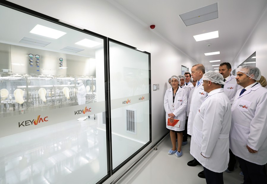 Turkish President Recep Tayyip Erdogan (C) visits the KeyVac Vaccine Production Center in Ankara, Türkiye, on Oct. 31, 2023. Hepatitis A vaccine, of which Türkiye gets mostly supplies from abroad, will be produced domestically, Erdogan said Tuesday. Erdogan made the remarks at the inauguration ceremony of the KeyVac Vaccine Production Center in Ankara, a joint venture of Türkiye's Alagoz Holding and China's Sinovac Biotech, with a total factory area of 29,500 square meters. (Xinhua/Li Zhenbei)