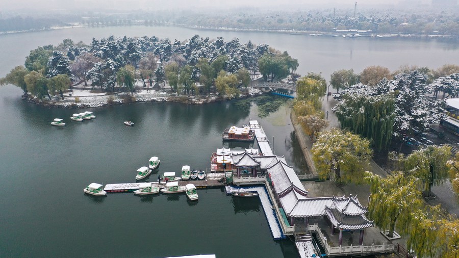 This aerial photo taken on Nov. 1, 2023 shows the snow-covered Changchun Nanhu Park in Changchun, northeast China's Jilin Province. (Xinhua/Zhang Nan)
