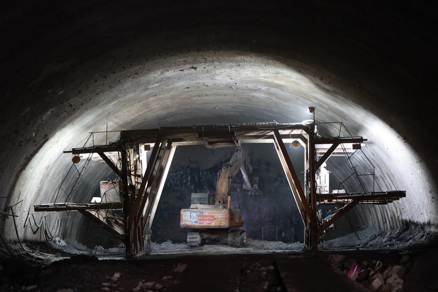 A machinery works at a construction site for a tunnel in Jiguan Mount as part of the expansion project for the Shanghai-Kunming Expressway in southwest China's Guizhou Province, Nov. 1, 2023. (Xinhua/Liu Xu)