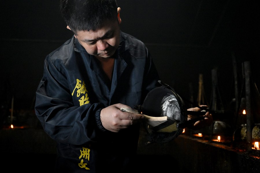 Zhou Jian collects tung oil soot from a bowl at a workshop of the Ancient Hu Kaiwen Ink Factory in Shexian County, Huangshan City of east China's Anhui Province, Oct. 25, 2023. Shexian County, located in Huangshan City of east China's Anhui Province, is known as the "Capital of Ink" dating back to the Southern Tang Dynasty (937-975). After it was renamed Huizhou in 1121, the term "Huizhou Ink", or "Hui Mo" in Chinese, stands for high-quality ink product in China. (Xinhua/Zhang Duan)