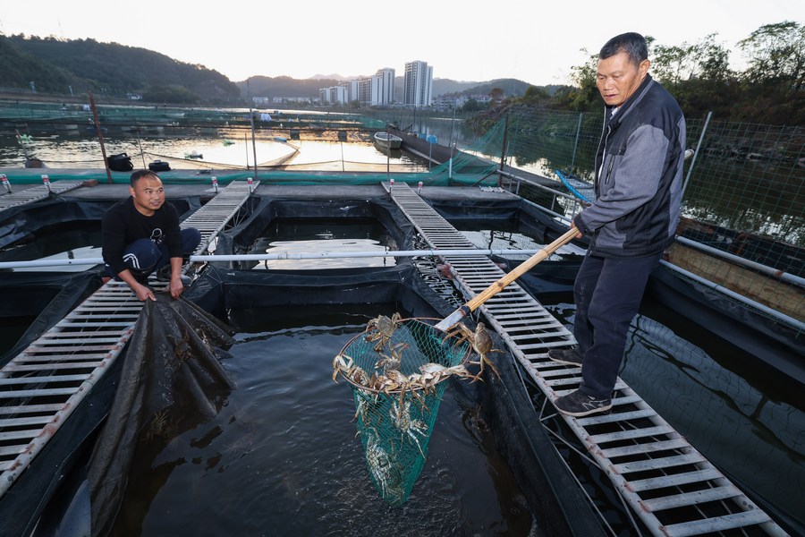 Farmers harvest crabs at a crab aquaculture farm at Jiande City, east China's Zhejiang Province, Nov. 1, 2023. (Xinhua/Xu Yu)