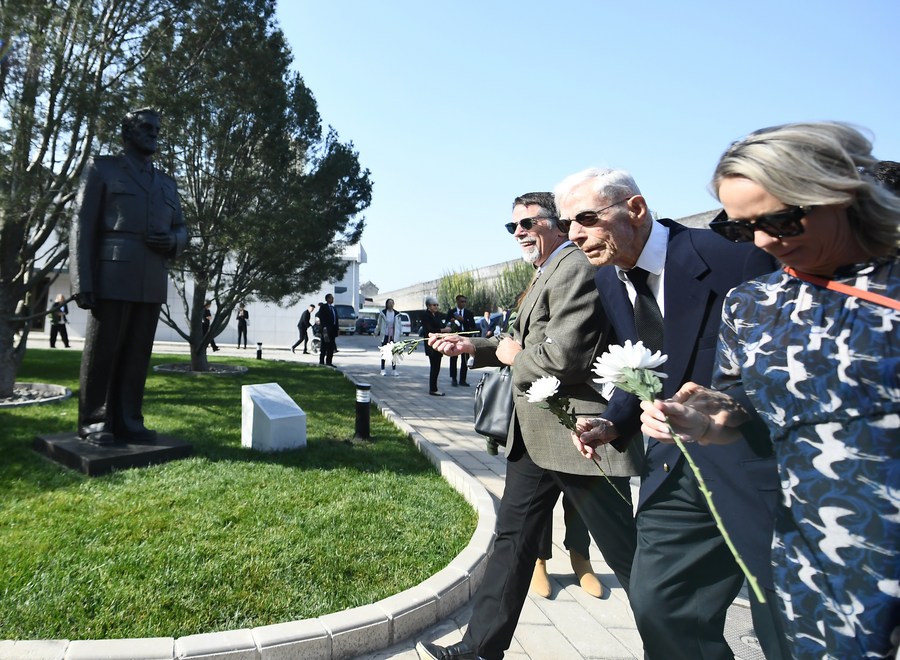 Flying Tigers veteran Harry Moyer (C) presents flowers to the statue of late U.S. general Claire Lee Chennault during an event to commemorate the 80th anniversary of the U.S. 14th Air Force's participation in China's war of resistance against Japanese aggression in Beijing, capital of China, Oct. 30, 2023. (Xinhua/Zhang Chenlin)