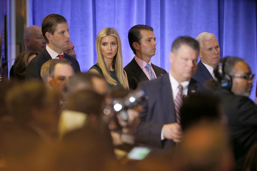 Eric Trump, Ivanka Trump and Donald Trump Jr. with U.S. Vice President-elect Mike Pence (from left to right, rear) attend a news conference held by U.S. President-elect Donald Trump in New York, the United States, on Jan. 11, 2017. (Xinhua/Gary Hershorn)