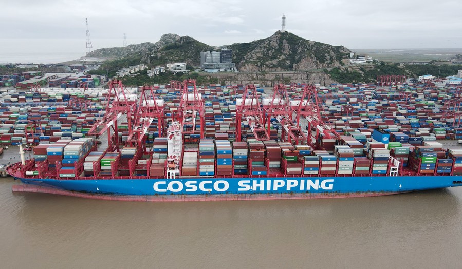 This aerial photo taken on Oct. 13, 2021 shows container vessel of the China COSCO Shipping docking at Yangshan Port, east China's Shanghai. (Xinhua/Fang Zhe)
