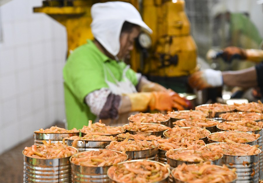 An employee processes Zhacai (pickled mustard tubers) products at a company in Fuling, southwest China's Chongqing Municipality, Oct. 16, 2023. (Xinhua/Wang Quanchao)