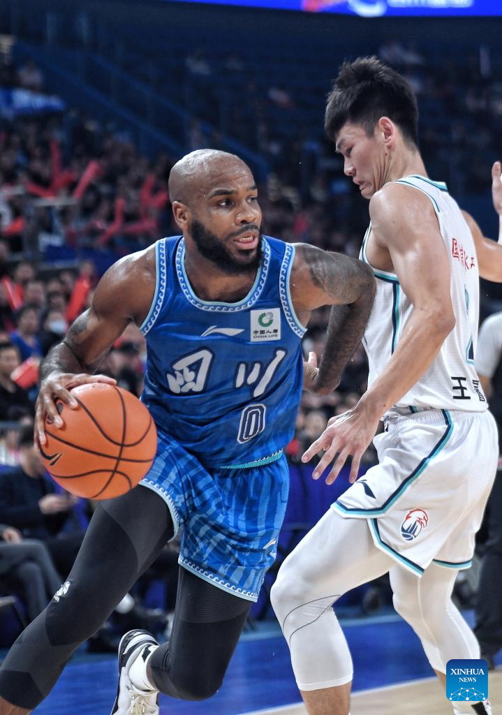 Myles Powell (R) of Qingdao Eagles competes during the 5th round match between Qingdao Eagles and Sichuan Blue Whale at the 2023-2024 season of the Chinese Basketball Association (CBA) league in Chengdu, southwest China's Sichuan Province, Nov. 3, 2023. (Xinhua/Liu Kun)