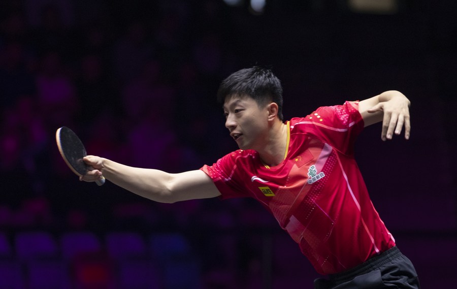 Chinese player Ma Long in action during the match against Omar Assar of Egypt at the men's singles event of the WTT Champions Frankfurt on Nov. 2, 2023. (Xinhua/Zhang Fan)