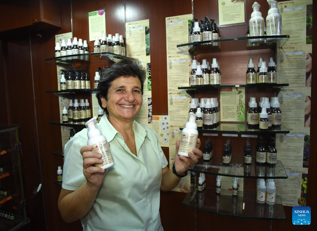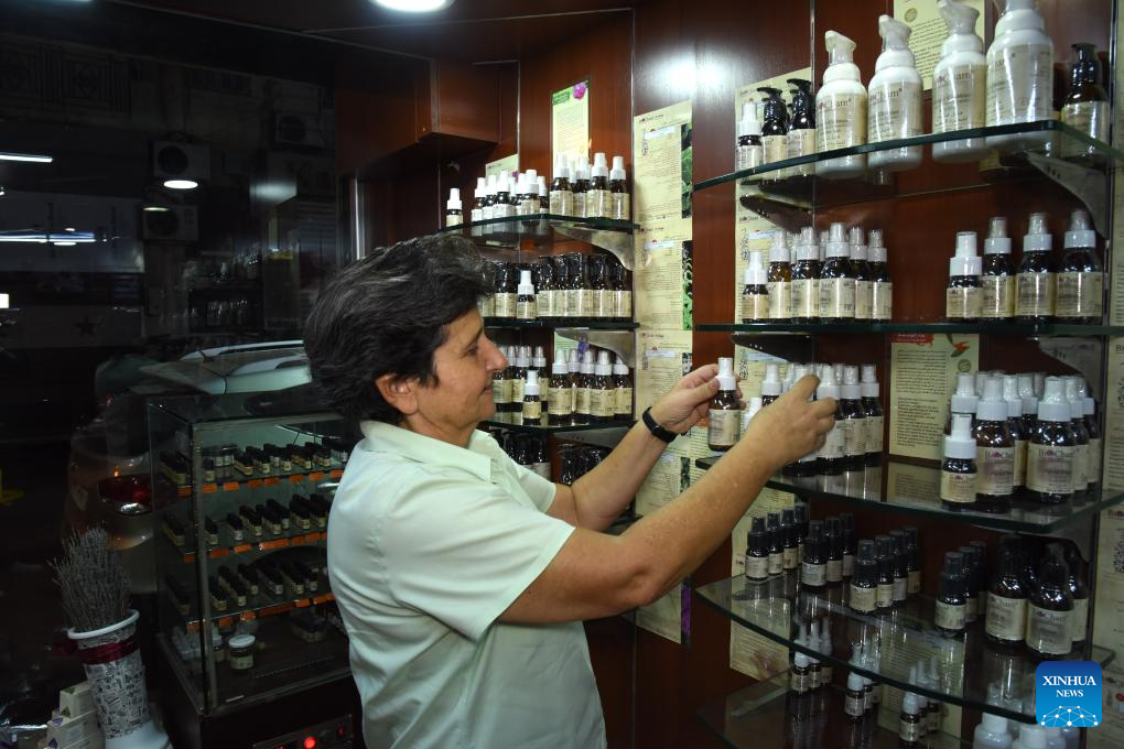 Roula Ali Adeeb, a Syrian businesswoman, arranges her products at a shop in Damascus, Syria, on Oct. 29, 2023. Filled with excitement about the opportunity to unveil a new brand image in the Chinese market, Roula Ali Adeeb, a Syrian businesswoman in the field of natural oil extracts for beauty and health, is looking forward to the upcoming China International Import Expo (CIIE). (Photo by Monsef Memari/Xinhua)