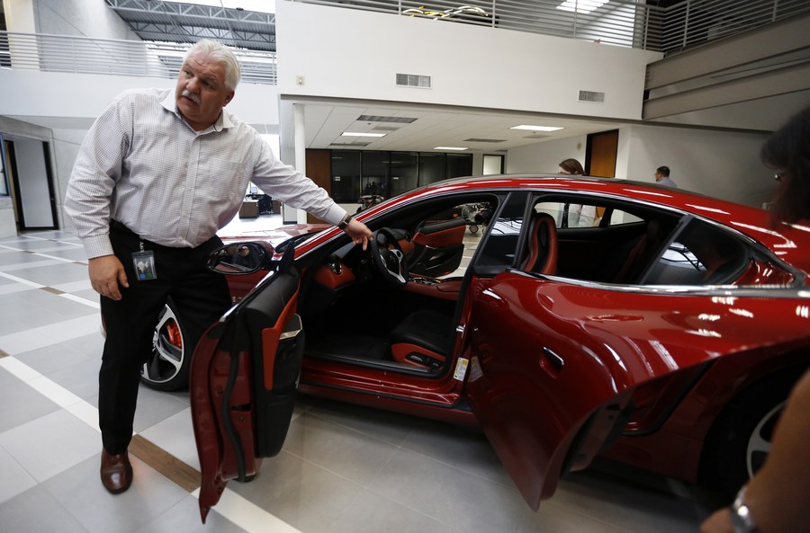 A staff member introduces a Karma 2020 Revero GT at Karma's headquarters in Irvine, California, the United States, June 25, 2019. Chinese-funded electric car producer Karma Automotive launched a new global all-electric product platform at its headquarters in Irvine, Southern California. (Xinhua/Li Ying)