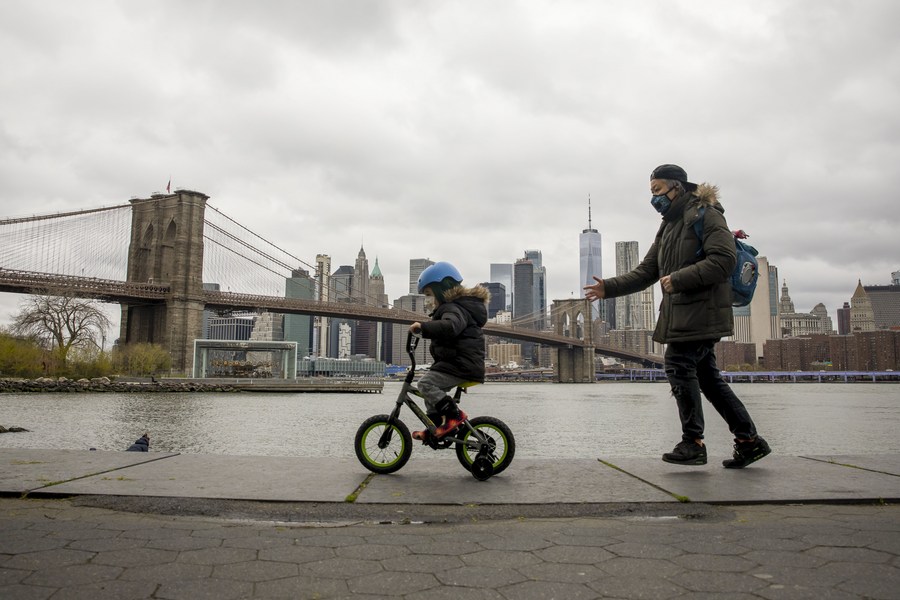 A senior walks with a child riding a bike in Main Street Park near the Brooklyn Bridge in New York, the United States, on April 27, 2020. (Photo by Michael Nagle/Xinhua)