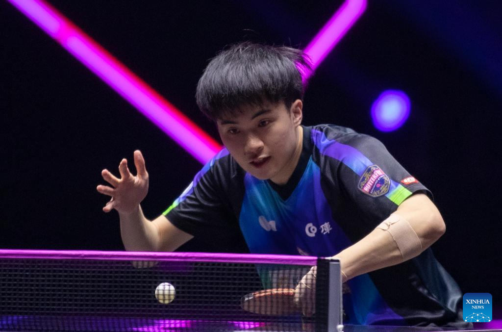 Lin Yun-Ju of Chinese Taipei hits a return during the men's singles quarterfinal match between Harimoto Tomokazu of Japan and Lin Yun-Ju of Chinese Taipei at the WTT Champions Frankfurt 2023 in Frankfurt, Germany, Nov. 3, 2023. (Xinhua/Zhang Fan)