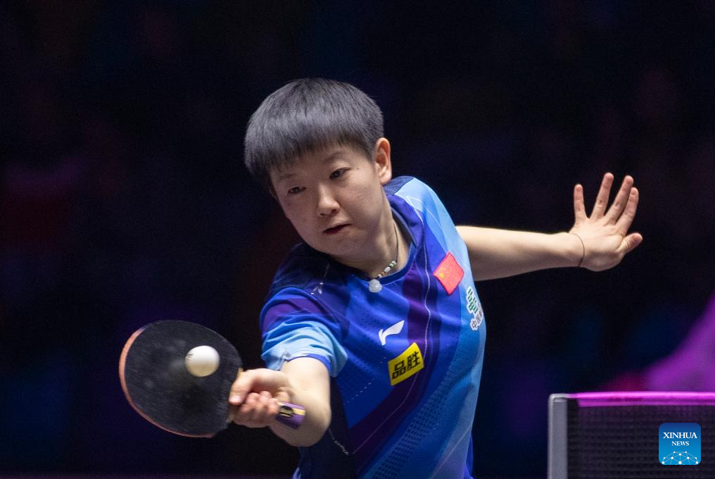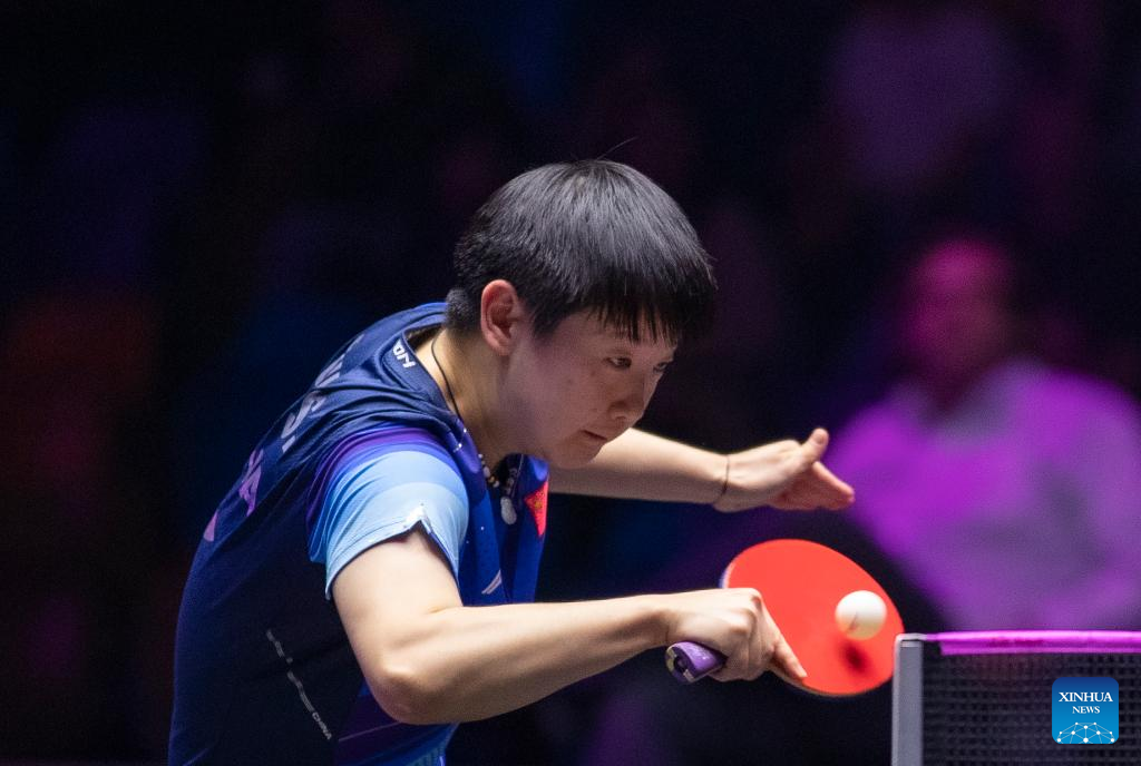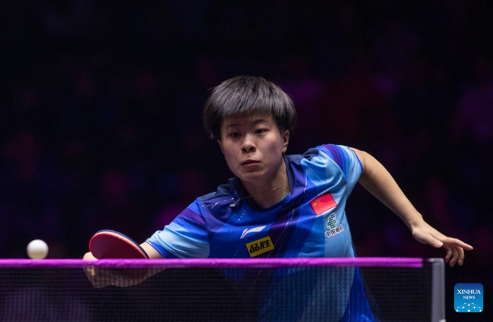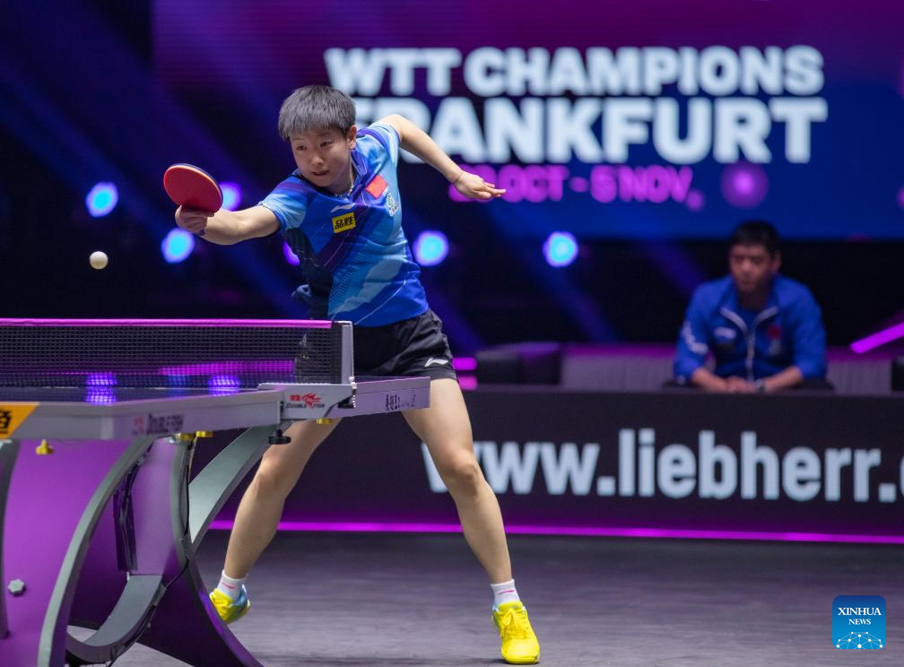 Wang Yidi of China hits a return during the women's singles Quarterfinal match between Wang Yidi of China and Ito Mima of Japan at the WTT Champions Frankfurt 2023 in Frankfurt, Germany, Nov. 3, 2023. (Xinhua/Zhang Fan)