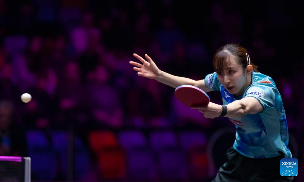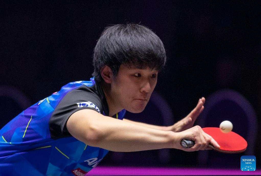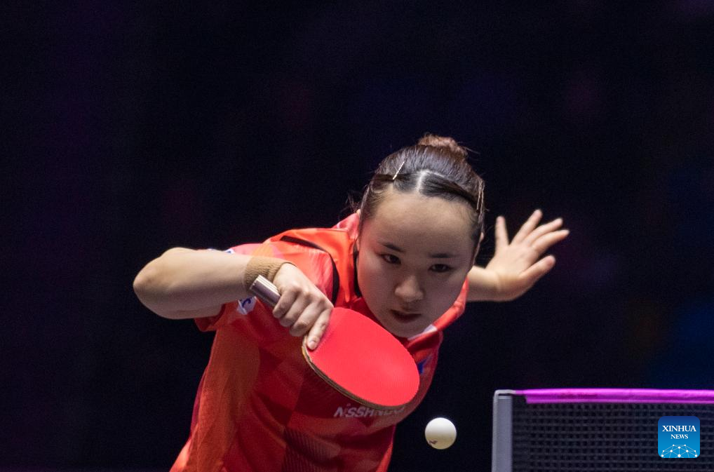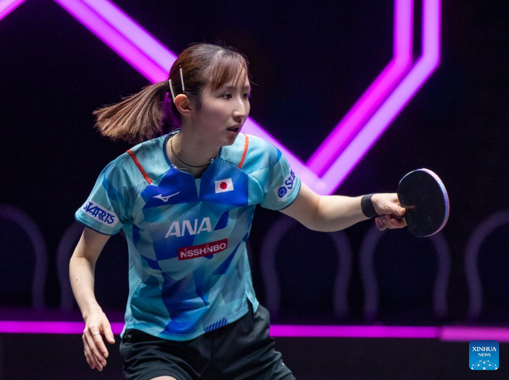 Hayata Hina of Japan hits a return during the women's singles quarterfinal match between Hayata Hina of Japan and Bernadette Szocs of Romania at the WTT Champions Frankfurt 2023 in Frankfurt, Germany, Nov. 3, 2023. (Xinhua/Zhang Fan)