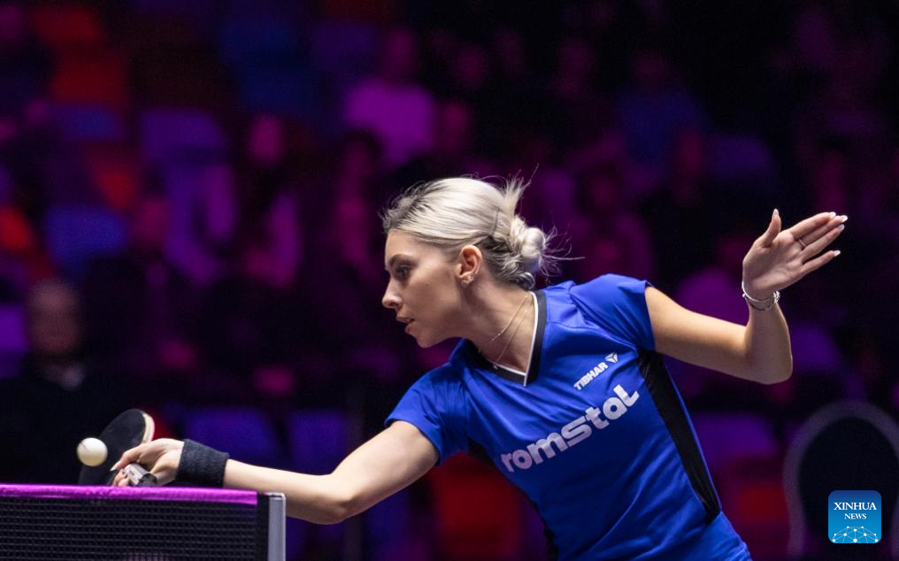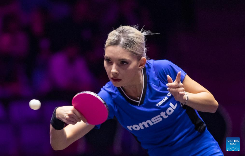 Bernadette Szocs of Romania hits a return during the women's singles quarterfinal match between Hayata Hina of Japan and Bernadette Szocs of Romania at the WTT Champions Frankfurt 2023 in Frankfurt, Germany, Nov. 3, 2023. (Xinhua/Zhang Fan)