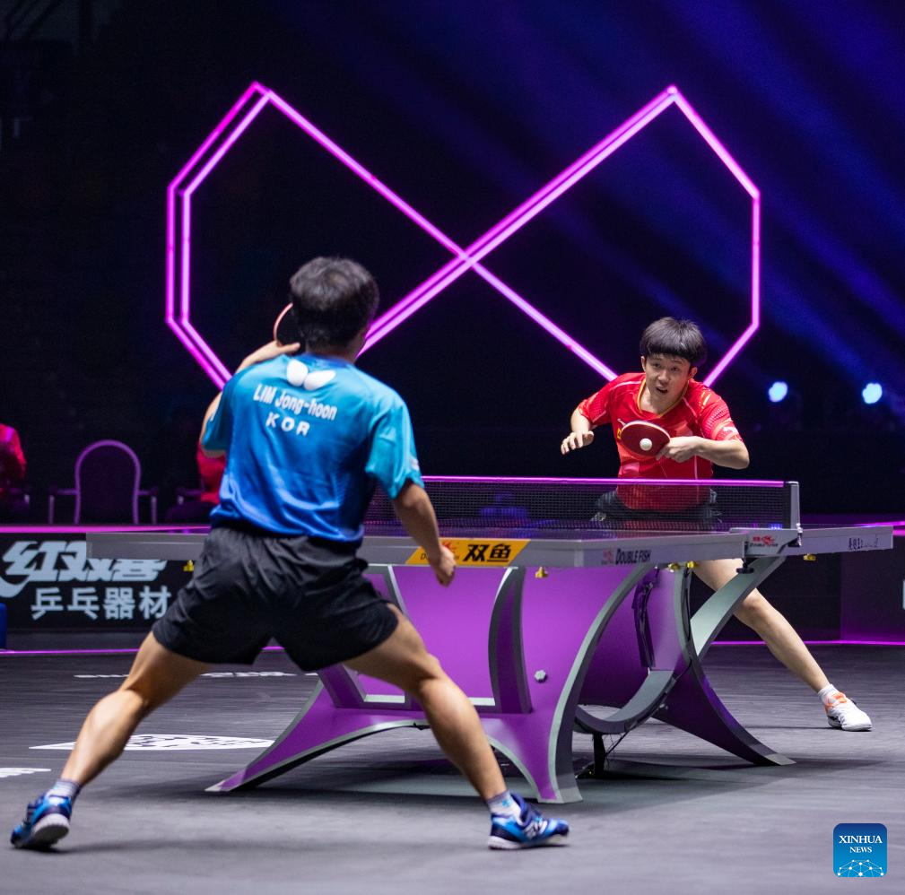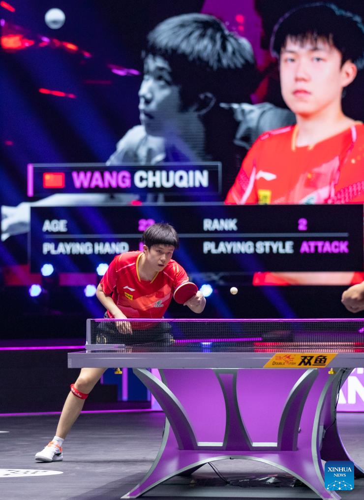 Wang Chuqin (R) of China hits a return during the men's singles quarterfinal match between Wang Chuqin of China and Lim Jonghoon of South Korea at the WTT Champions Frankfurt 2023 in Frankfurt, Germany, Nov. 3, 2023. (Xinhua/Zhang Fan)