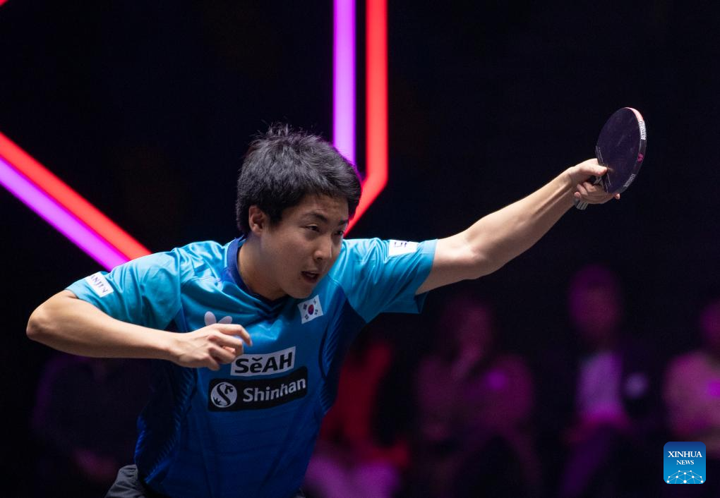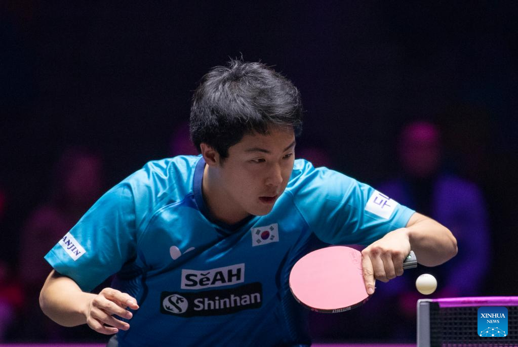 Lim Jonghoon of South Korea hits a return during the men's singles quarterfinal match between Wang Chuqin of China and Lim Jonghoon of South Korea at the WTT Champions Frankfurt 2023 in Frankfurt, Germany, Nov. 3, 2023. (Xinhua/Zhang Fan)