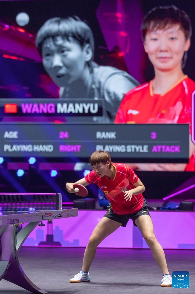 Wang Manyu of China hits a return during the women's singles Quarterfinal match between Wang Manyu of China and Joo Cheonhui of South Korea at the WTT Champions Frankfurt 2023 in Frankfurt, Germany, Nov. 3, 2023. (Xinhua/Zhang Fan)