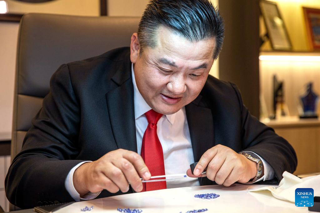 Li Jiachun, a 48-year-old jeweler who is the chairman of the Thai Chinese New Generation Business Association, picks gems in Bangkok, Thailand, Oct. 27, 2023.(Xinhua/Wang Teng)