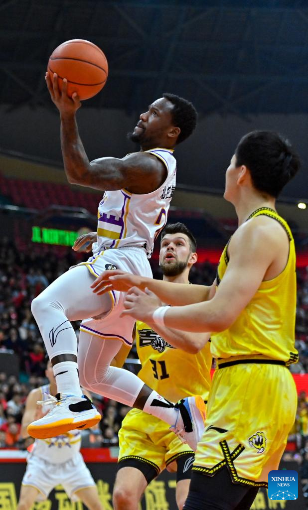 Kay Felder (R) of Beijing Royal Fighters goes for a lay-up during the 6th round match between Jilin Northeast Tigers and Beijing Royal Fighters at the 2023-2024 season of the Chinese Basketball Association (CBA) league in Changchun, northeast China's Jilin Province, Nov. 4, 2023. (Xinhua/Yan Linyun)