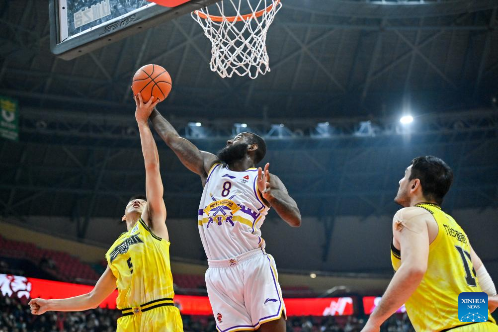 Kay Felder (1st L) of Beijing Royal Fighters goes for a lay-up during the 6th round match between Jilin Northeast Tigers and Beijing Royal Fighters at the 2023-2024 season of the Chinese Basketball Association (CBA) league in Changchun, northeast China's Jilin Province, Nov. 4, 2023. (Xinhua/Yan Linyun)
