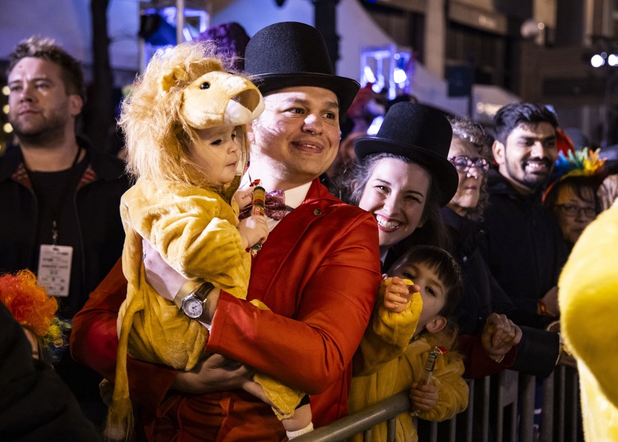 Costumed spectators are pictured at the Art in the Dark Halloween Parade on State Street in downtown Chicago, the United States, Oct. 21, 2023. (Photo by Joel Lerner/Xinhua)