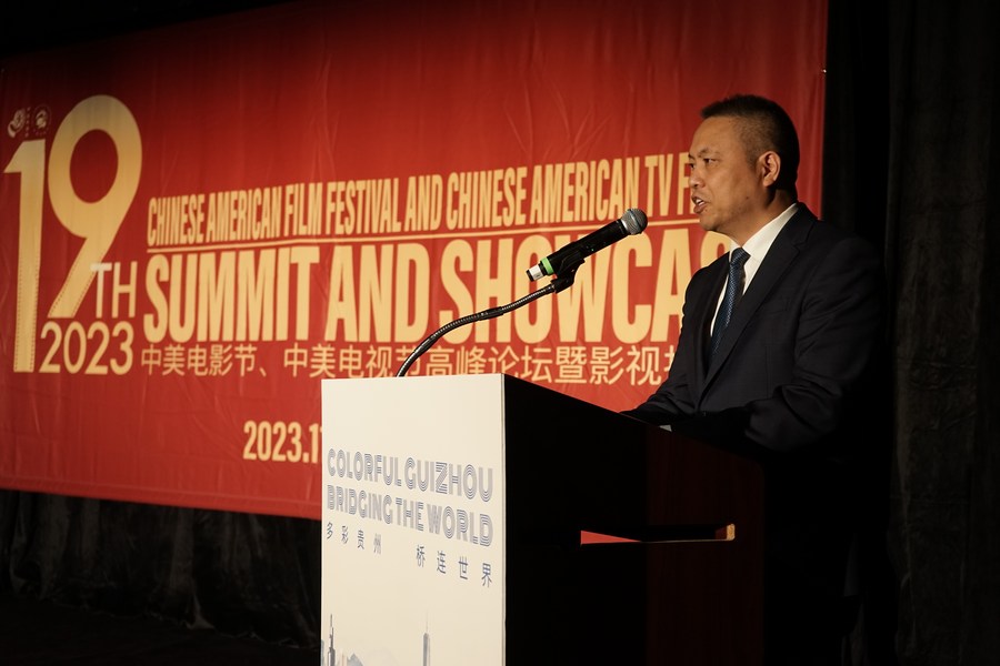 He Yunjiang, director of the Radio and Television Bureau of Guizhou Province, delivers a speech at a cultural and tourism event to promote China's Guizhou Province in Los Angeles, the United States, Nov. 2, 2023. The event was held on the sidelines of the 19th Chinese American Film Festival and the Chinese American Television Festival, which kicked off in Los Angeles Wednesday evening. (Photo by Zeng Hui/Xinhua)