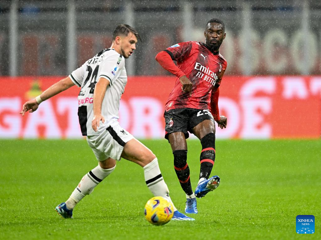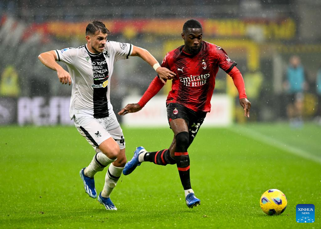 AC Milan's Fikayo Tomori (R) vies with Udinese's Lazar Samardzic during the Serie A football match between AC Milan and Udinese in Milan, Italy, Nov. 4, 2023. (Photo by Alberto Lingria/Xinhua)