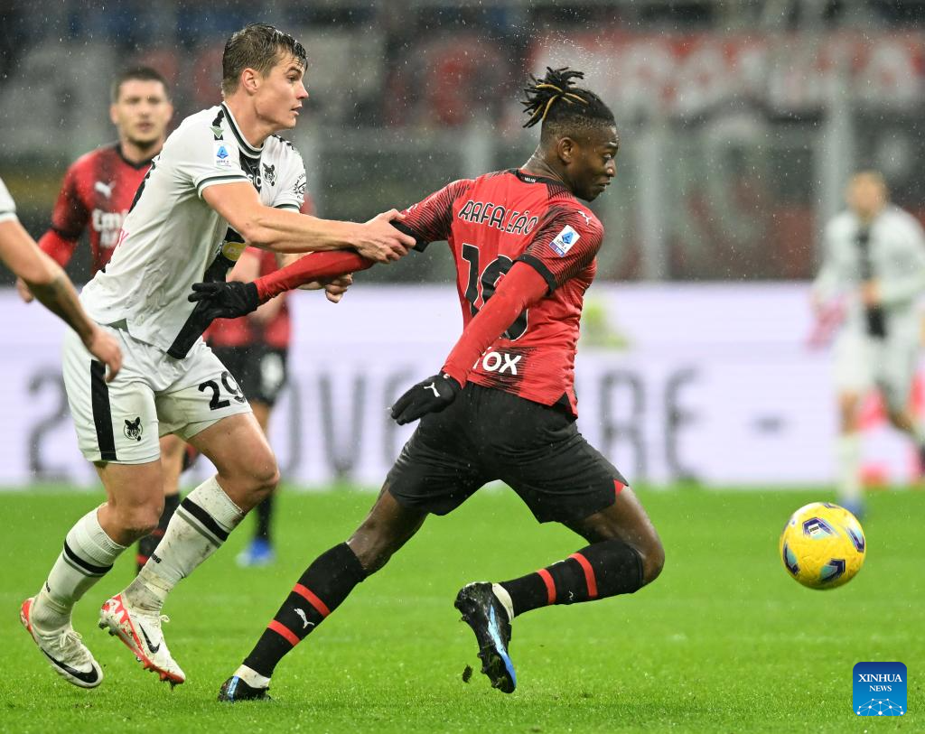 AC Milan's Rafael Leao (R) vies with Udinese's Jake Bijol during the Serie A football match between AC Milan and Udinese in Milan, Italy, Nov. 4, 2023. (Photo by Alberto Lingria/Xinhua)