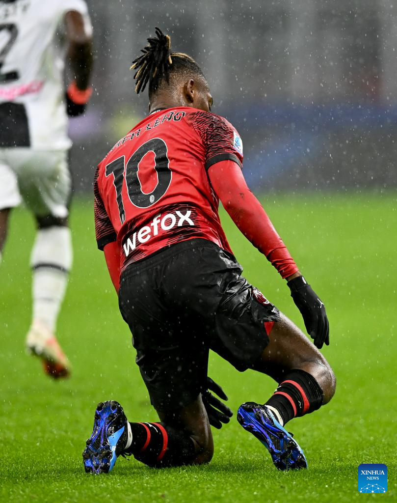 AC Milan's Rafael Leao reacts during the Serie A football match between AC Milan and Udinese in Milan, Italy, Nov. 4, 2023. (Photo by Alberto Lingria/Xinhua)