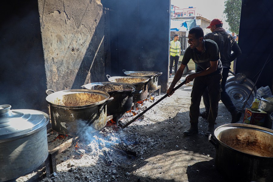 People cook food on firewood after a gas cutoff in the southern Gaza Strip city of Rafah, Nov. 3, 2023. (Photo by Rizek Abdeljawad/Xinhua)