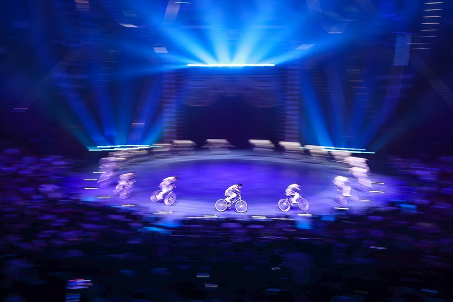 Acrobats take their curtain call after a performance during the 7th China International Circus Festival in Zhuhai, south China's Guangdong Province, Nov. 5, 2023. (Xinhua/Liu Dawei)