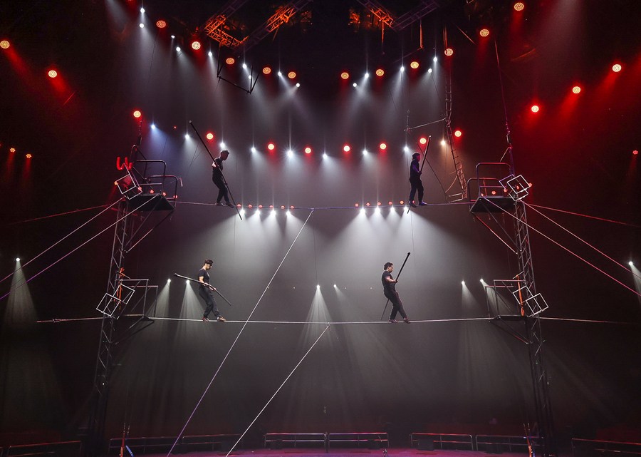 Acrobats from the China National Acrobatic Troupe perform during the 7th China International Circus Festival in Zhuhai, south China's Guangdong Province, Nov. 5, 2023. (Xinhua/Liu Dawei)