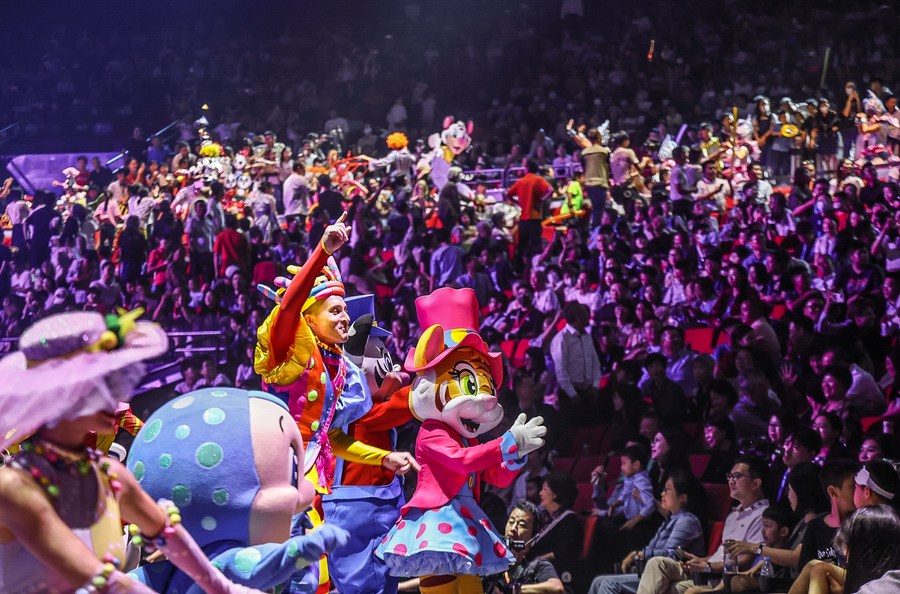 Acrobats interact with the audience at the opening ceremony of the 7th China International Circus Festival in Zhuhai, south China's Guangdong Province, Nov. 4, 2023. (Xinhua/Liu Dawei)■