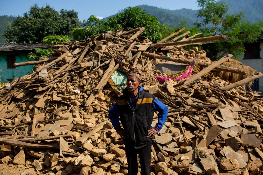 A man stands in front of a house destroyed in an earthquake in Jajarkot, Nepal, on Nov. 6, 2023. (Photo by Sulav Shrestha/Xinhua)