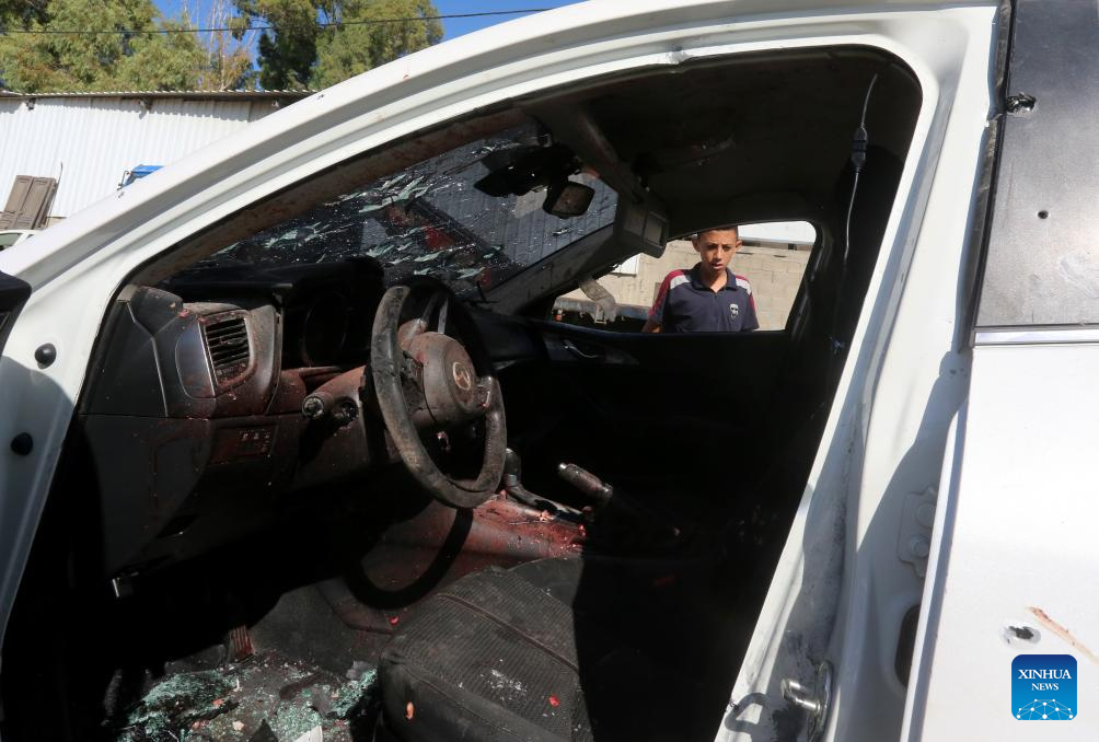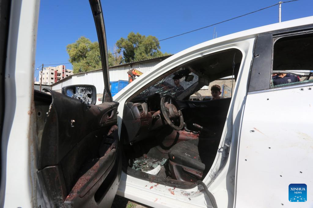 Photo taken on Nov. 7, 2023 shows a car damaged in an attack by Israeli forces in Tulkarm, northern West Bank. (Photo by Nidal Eshtayeh/Xinhua)