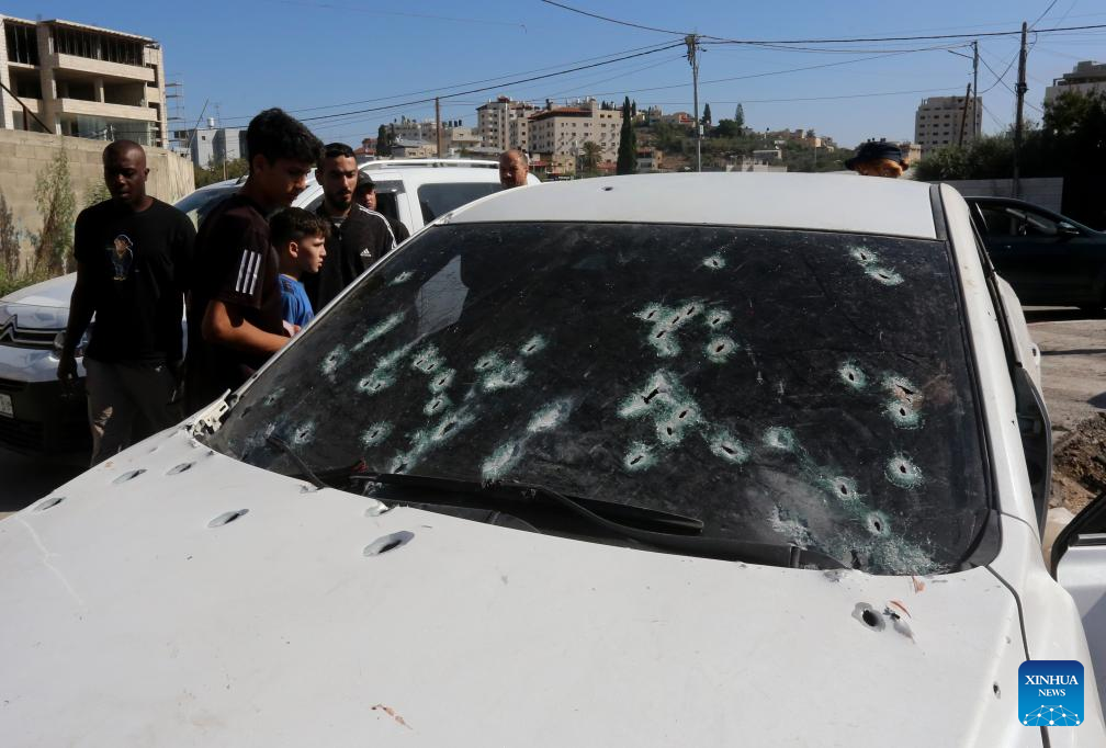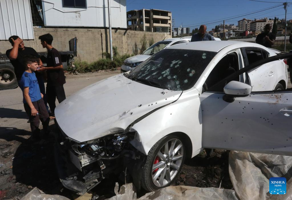 People check a car damaged in an attack by Israeli forces in Tulkarm, northern West Bank, on Nov. 7, 2023. (Photo by Nidal Eshtayeh/Xinhua)
